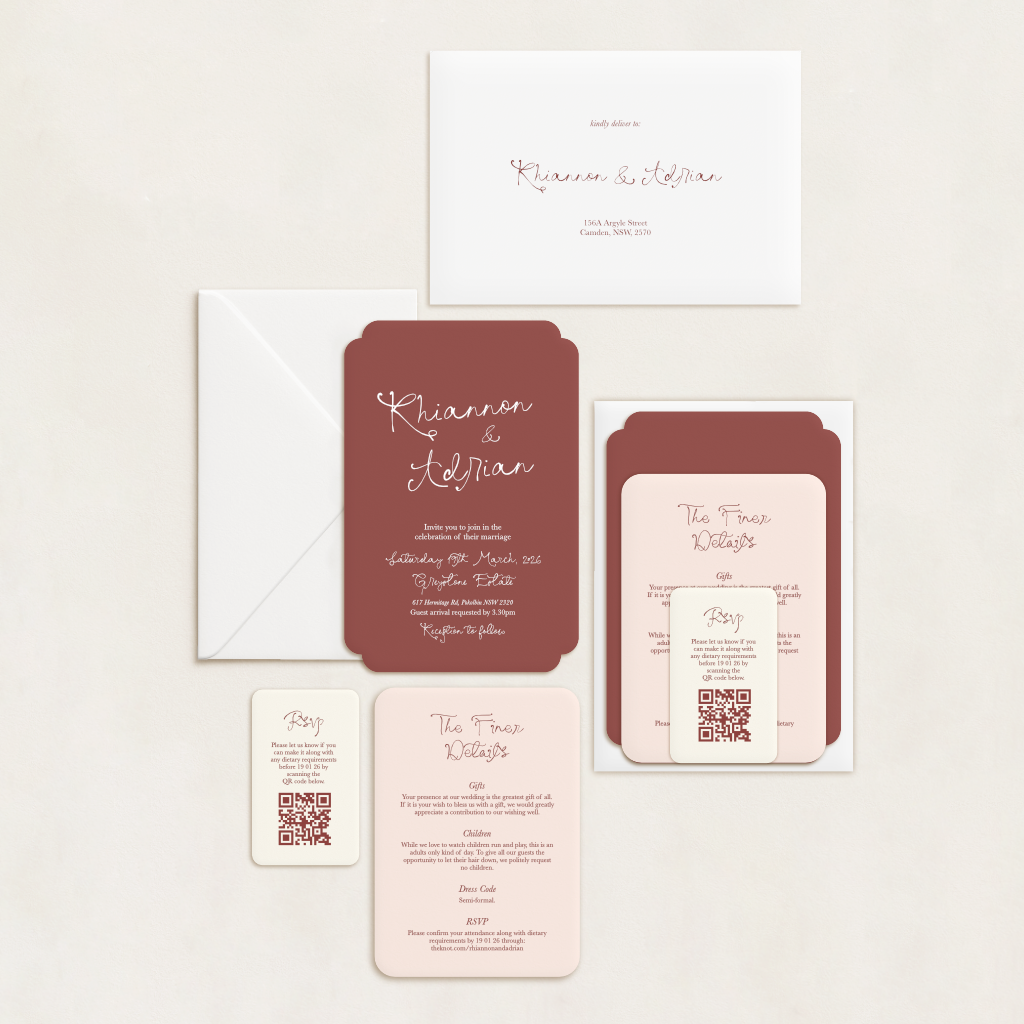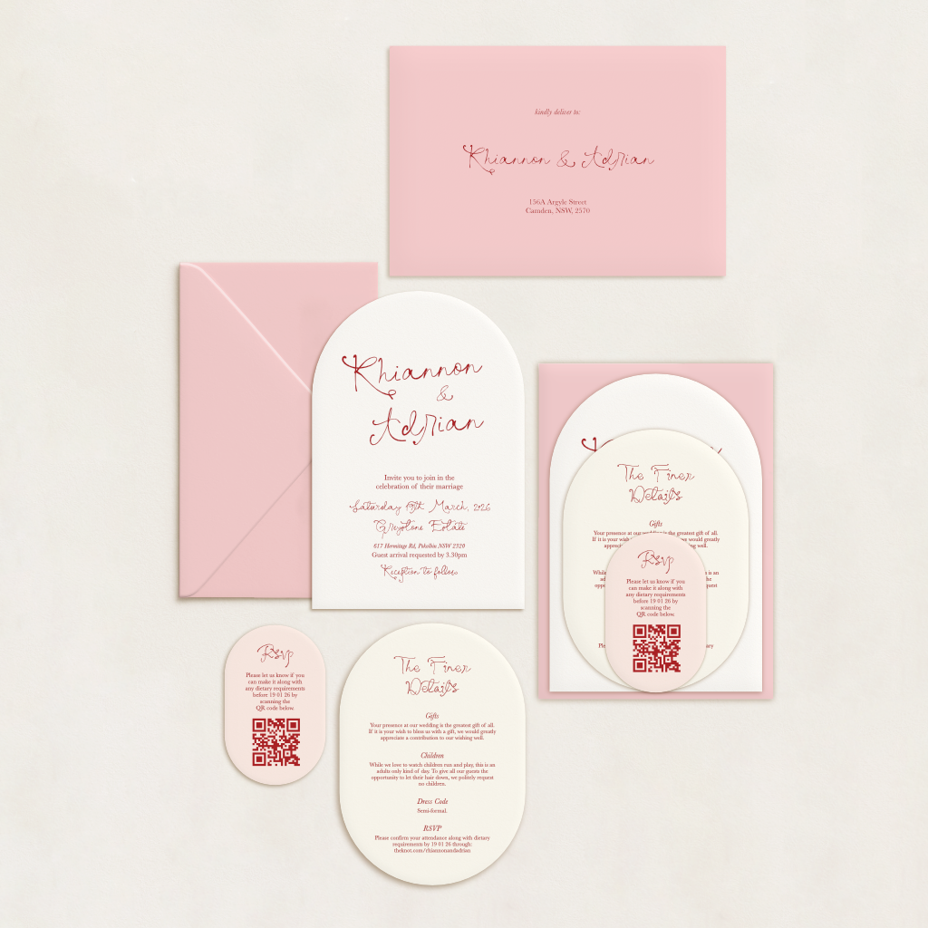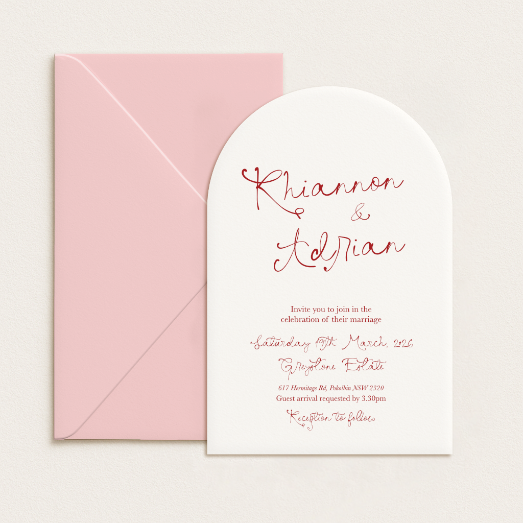 Each suite can include up to three cards (invitation, RSVP, and details card) and a printed envelope. You’ll choose your shape and cardstock colour for each piece, plus whether you’d like standard or white ink. Coloured envelopes are included, too – so you don’t have to compromise on style.