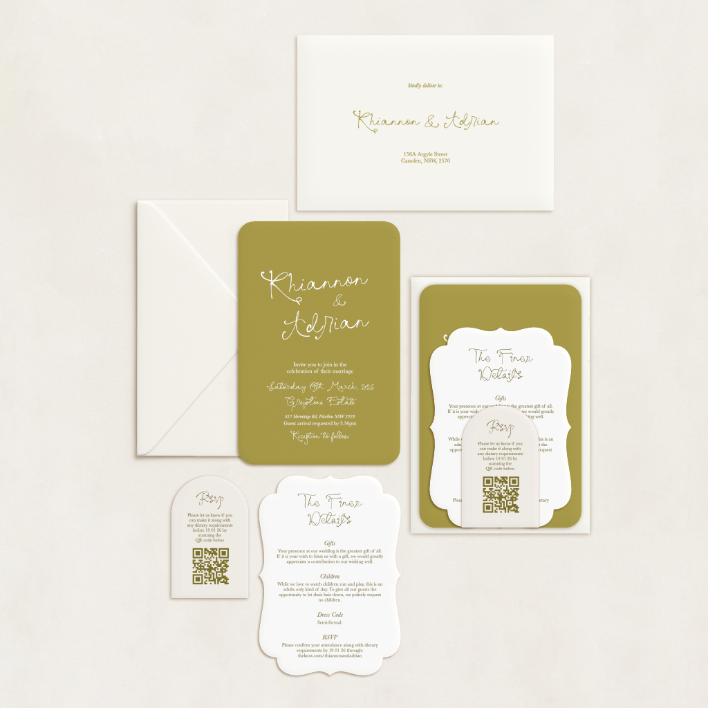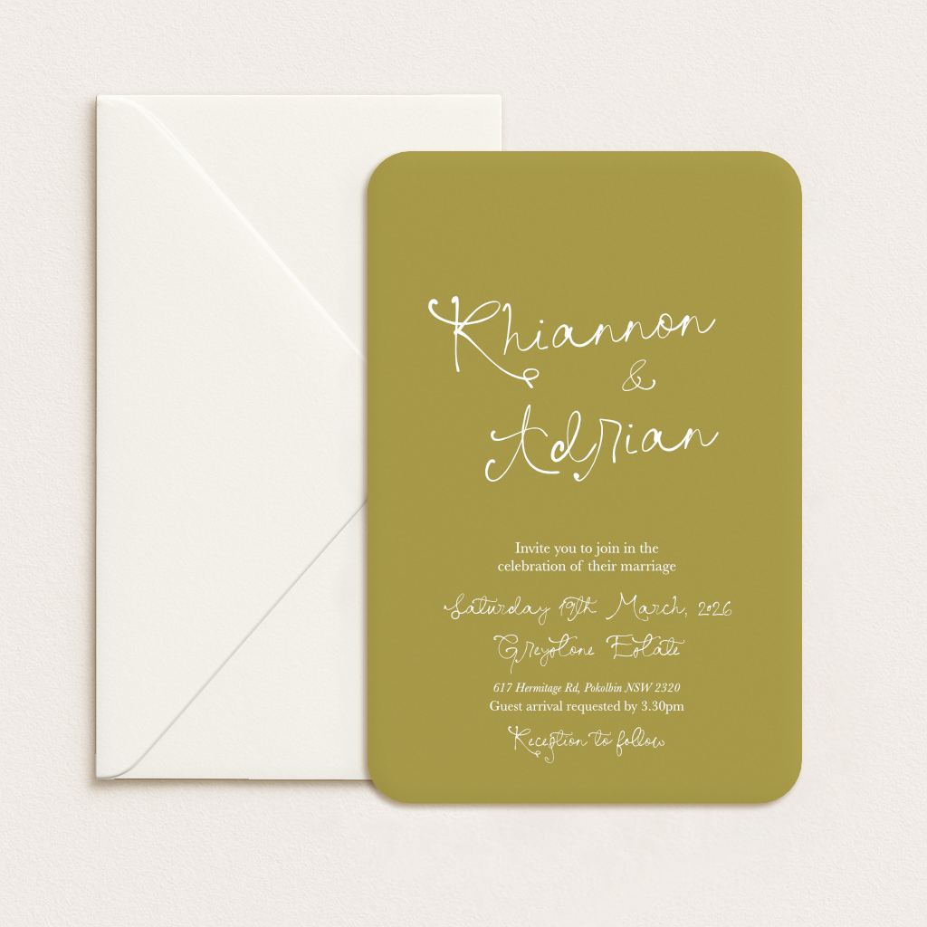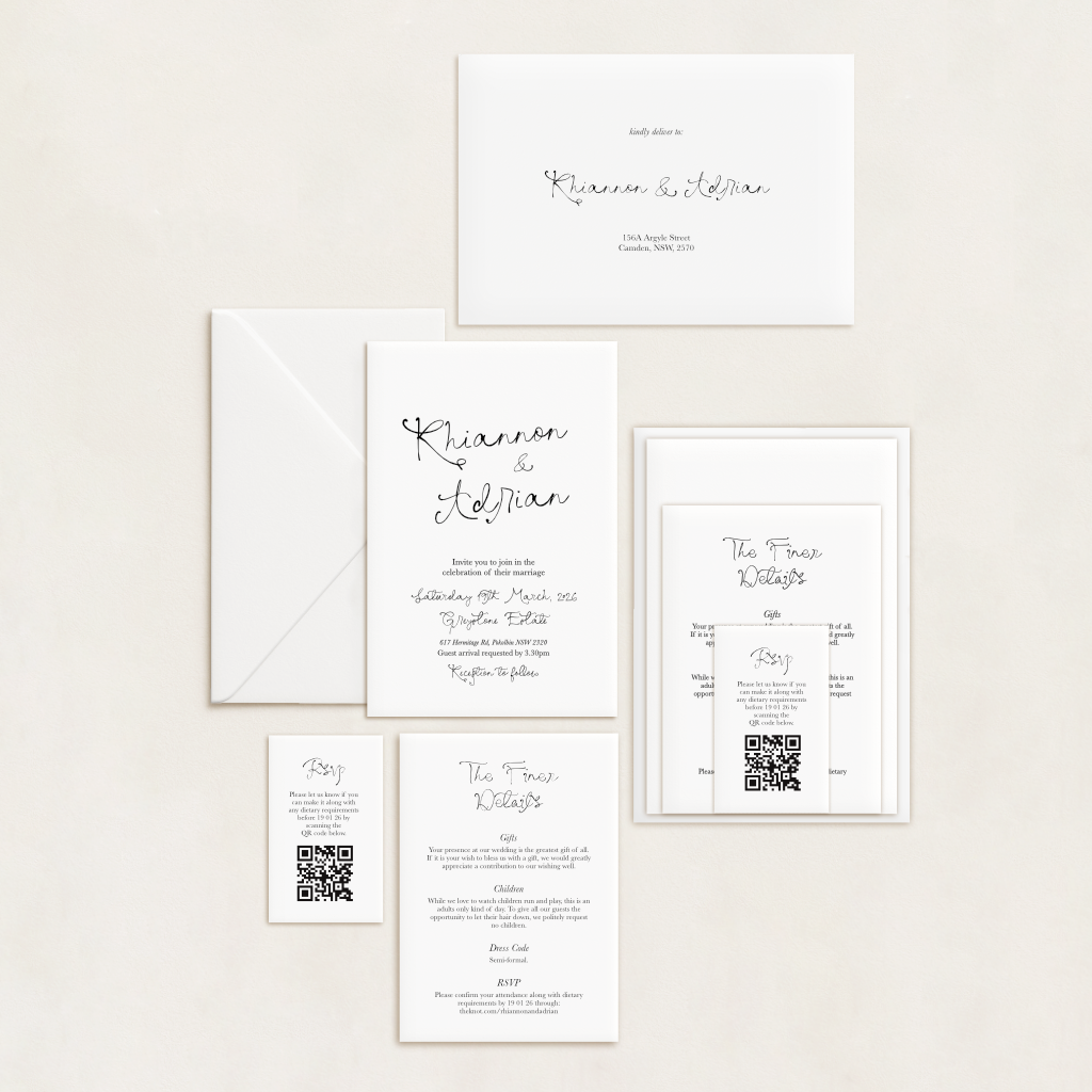 Each suite can include up to three cards (invitation, RSVP, and details card) and a printed envelope. You’ll choose your shape and cardstock colour for each piece, plus whether you’d like standard or white ink. Coloured envelopes are included, too – so you don’t have to compromise on style.