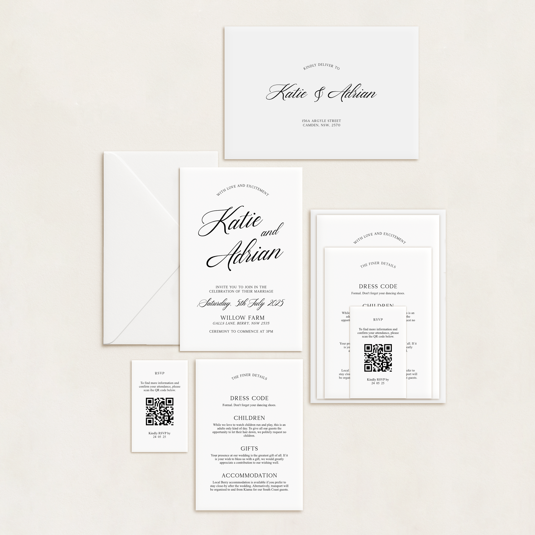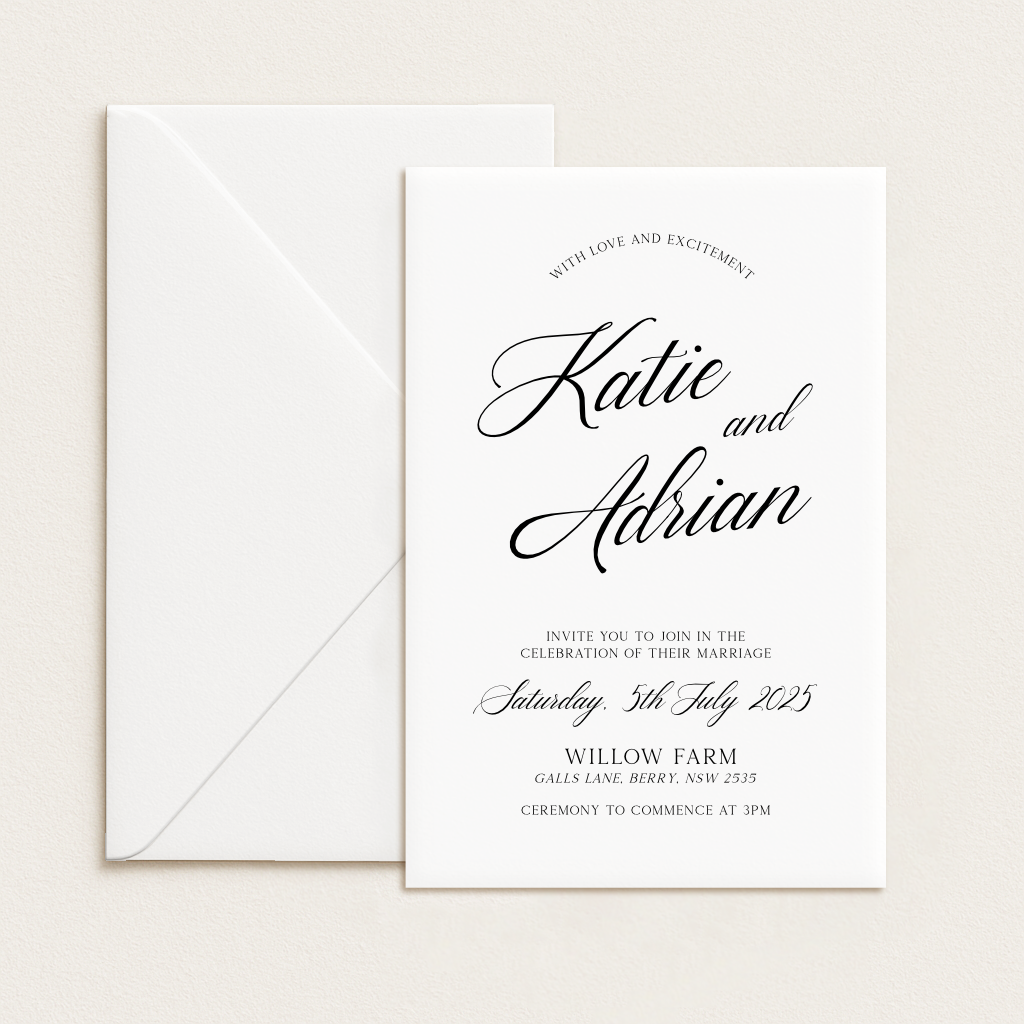 Each suite can include three cards (typically the invitation, RSVP, and details card) and a printed envelope. You’ll choose your shape and cardstock colour for each piece, plus whether you’d like standard or white ink. Coloured envelopes are included, too — so you don’t have to compromise on style.